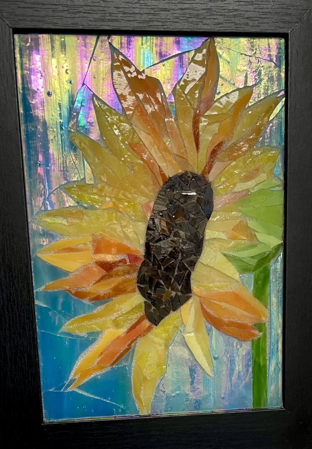 This sunflower mosaic was part of a series (1 of 3) that i made in the spring of 2025. The light blue glass has an iridescent shimmer when touched by light. adding another level of detail depending on where you decide to hang this piece.